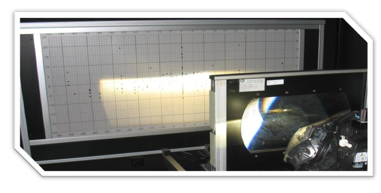 測試前照燈配光特性的方法,按有關國家標準規定,是在汽車前方25m(信號燈10m)處放置一屏幕,測試近光燈在屏幕上的照度分布,如下圖: