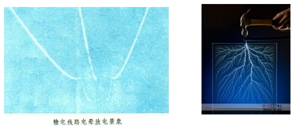 當(dāng)加上高壓后,會(huì)在電極附近產(chǎn)生空氣的局部放電——電暈放電,電壓再加高時(shí),電暈放電更加強(qiáng)烈,致使間隙內(nèi)發(fā)生刷狀放電,而后就擊穿了(電弧放電)。如棒-板間隙,在尖電極附近電場(chǎng)強(qiáng)度最大,加上高壓后,電極附近先產(chǎn)生電暈放電,而板上的電力線(xiàn)很疏,不會(huì)產(chǎn)生電暈。