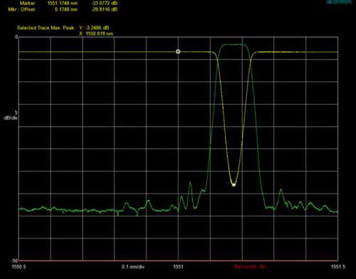 圖2:FBG 的插入損耗IL(黃色)、返回損耗RL(綠色)測試,橫軸:0.1nm/div