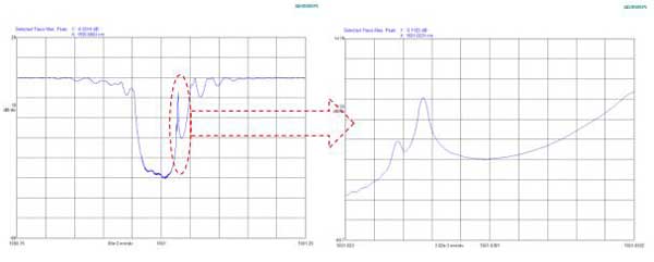 圖3:窄帶寬FBG的插入損耗(IL)測試。橫軸:50pm/div (左),3pm/div (右)。