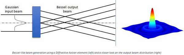 貝塞爾(Bessel)光束是在一定程度上對衍射“免疫”的獨特光束 — 在傳播過程中,在一定范圍內它不會像通常的光因衍射而發散。這種光束由貝塞爾函數描述,它描繪了一種具備多環結構的截面分布。