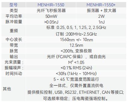 無論是實驗室自搭,建還是高科技公司商品化的基于鎖模飛秒激光器的光頻梳,其飛秒激光器部分都是整個光梳系統(tǒng)內硬件成本占比最高的部分。其中瑞士Menhir公司的GHz重復頻率的光纖飛秒激光器在搭建GHz大梳齒間隔的光頻梳應用上為廣大科研以及OEM用戶所接受與推崇。其常用產品分為250MHz,1GHz,2.5GHz三種重復頻率的型號,波長在1545-1565nm,脈沖寬度250fs; 重復頻率越高價格越高。