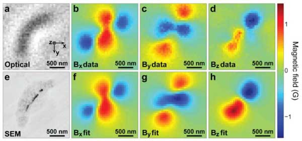 圖5。(a)趨磁細菌的光學圖像。(e)同一細菌的SEM圖像,其中磁性納米粒子(黑色)清晰可見。(b,c,d)磁場x, y, z分量由NV金剛石光學探測磁共振測量確定。(f,g,h)實測場分布的數(shù)值擬合(來自[g])。