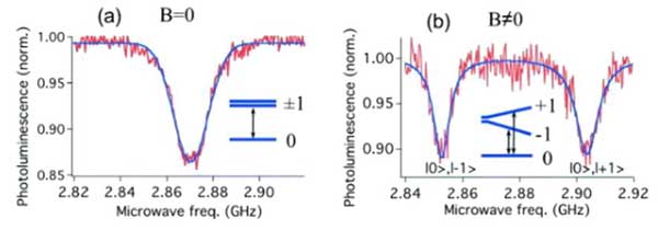 眾所周知,金剛石中的缺陷會使原本透明的晶體產(chǎn)生顏色(例如,氮取代缺陷使金剛石呈現(xiàn)黃色,而硼取代則產(chǎn)生藍色)。在532nm激光激發(fā)下,NV在637 nm處產(chǎn)生熒光衰減。重要的是?s=±1自旋態(tài)是無輻射衰減,從而提供了一種利用監(jiān)測光致發(fā)光變化來檢測自旋狀態(tài)的方法。也就說,當自旋態(tài)被激發(fā)到不穩(wěn)定態(tài)?s =±1級(使用2.87 GHz微波),有缺陷的紅光輸出會略有減少(圖4 (a))。此外,?s =±1的能級狀態(tài)可以被外部磁場調(diào)節(jié)。通過測量吸收峰之間的頻率分裂(如圖4(b)所示),可以測量出該外部磁場。