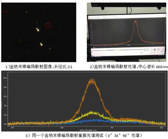位于襯底、溶液、膠體或細胞中的金屬納米顆粒/團簇是典型的均一樣品中的小尺度結構,因此暗場顯微技術是一種非常有效的觀測手段。更為有趣也更為重要的特性是,因為納米顆粒的介觀特征、表面活性,它們對電磁波的響應既不同于單獨的原子/分子,也不同于長程有序的晶體。因此除了暗場散射成像以外,進一步研究此類粒子散射光的光譜特征,有助于理解納米顆粒的尺度,狀態,動力學過程,以及與周邊環境的相互作用信息。暗場散射光譜廣泛用于金屬納米顆粒研究,表面納米結構研究,納米管及納米線,以及Plasmon Ruler等。