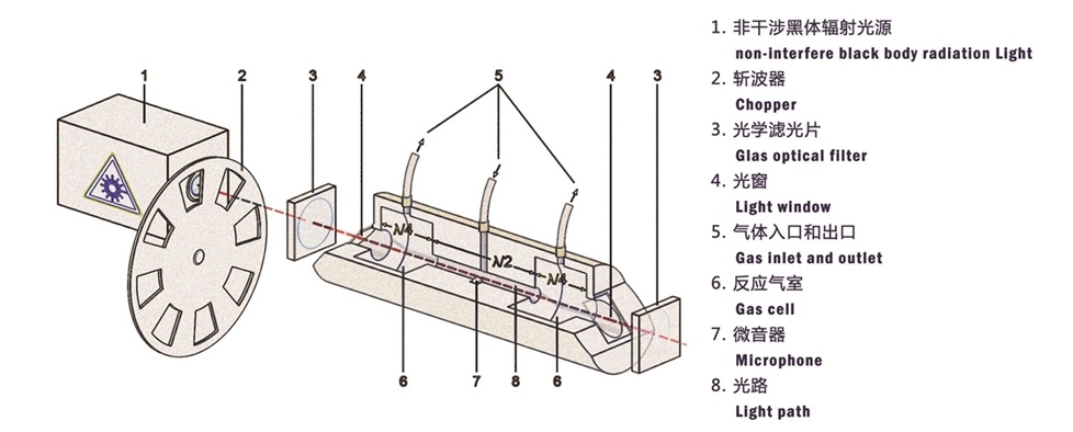 我公司代理的光聲光譜痕量氣體分析儀采用非干涉黑體輻射源作為光源,轉換效率達到90%,配合濾光片與斬波器,發出可調制光源至光聲池。光聲池底部配有高精密微音器,檢測由光信號轉變的聲信號。繼而計算出與聲信號成比例的氣體濃度,靈敏度可達到0.01ppm,甚至更高。