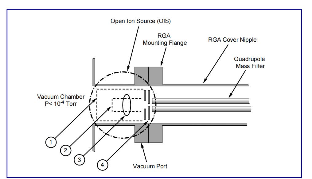 在大多數商用RGAs中使用的標準離子源是開放離子源(OIS)。這種電離器被認為是RGA的“全做”源。自20世紀50年代初以來,它就一直呈圓柱形,軸向對稱的形式存在。通用的OIS設計原理圖如圖1所示。