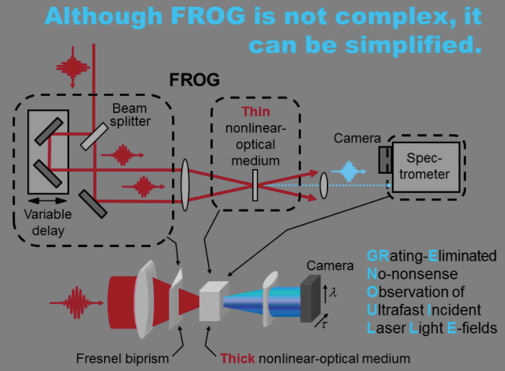 作為超快激光頻譜及位相測試方法的一種,FROG(FrequencyResolved Optical Gating)是一種比SPIDER 更為簡便的方法,通過分析單次自相關信號的光譜,并輔以擬合運算程序來反解飛秒激光的時頻特征。Swamp Optics 公司多年來致力于FROG 類測量儀器的研制,并推出了功能更為強大、使用更為方便的GRENOUILLE 測量儀。