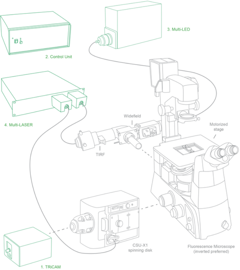 兼容:LIFA兼容每一個帶有相機輸出的熒光顯微鏡,包括徠卡、尼康、奧林巴斯、TILL和蔡司的熒光顯微鏡,寬場熒光顯微配置,轉盤共焦熒光顯微配置,全內反射熒光顯微TIRF配置;