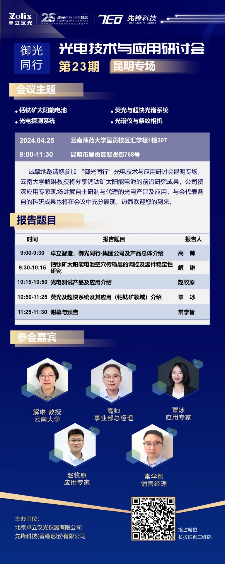 由先鋒科技與卓立漢光聯(lián)合舉辦的第23期“御光同行”光電技術(shù)與應(yīng)用研討會昆明專場將于2024年4月25日上午9:00-11:30在昆明召開。