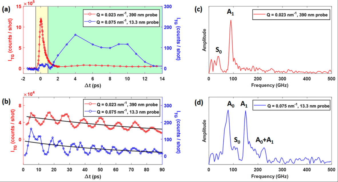 Naumenko等人報告了使用EUV TG測量57 nm厚碳化硅(SiC)薄膜在Q大于1 um-1情況下的機械和熱響應[ACS Appl. Nano Mater. 2019, 2: 5132−5139]。SiC是一種重要的第三代半導體材料,可用于新型高功率半導體器件,同時在基礎科學和應用科學領域都有廣泛的研究。其熱響應的特征時間尺度與預期存在較大偏差,這意味著在小尺寸下擴散區可能容易被擊穿,因此利用EUV TG對該薄膜進行納米級熱彈性性質進行完整的表征非常重要。從圖2中可以看出,接近Δt = 0時光學和 EUV 探針突顯了明顯的差異。光學探針獲得的數據特點是ITG急劇增加,然后快速衰減,具有緩慢的調制;而EUV 探針獲得的波形僅在Δt = 0附近顯示小的“階躍狀”行為。這是因為光學探測對激發產生的電子空穴對非常敏感,即對EUV TG相互作用突然產生的電子激發的布居光柵非常敏感。而在EUV探測的TG中,折射率變化主要由總電子密度的變化決定,因為EUV 波長遠離任何電子-核共振。因此,光學探測的EUV TG實驗中觀察到的快速電子衰變涉及許多過程:電子-聲子耦合、俄歇復合、碰撞電離、擴散、電荷俘獲等,對每個過程的動力學評估都需要詳細研究。