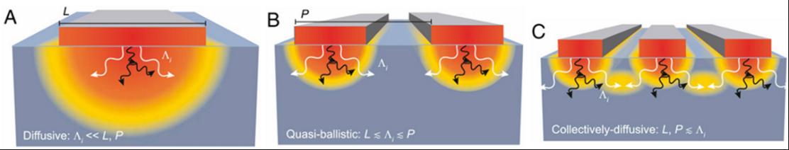 圖3 納米尺度熱傳輸由三個特征尺度決定[PNAS, 2015, 112(16): 4846–4851]:熱源尺寸 L、熱源間距 P 以及載熱聲子的 MFP Λi。(A) 當所有 MFP 都小于 L 時,散熱完全來自擴散效應。(B) 當 L 收縮時,長 MFP 聲子呈彈道狀傳播,相對于擴散預測,散熱速率有所降低,此時短 MFP 聲子仍保持擴散性。(C) 當 L 和 P 同時減小,來自相鄰熱源的長 MFP 聲子會像來自單個大型熱源一樣相互作用,從而實現更高效的擴散式傳熱。