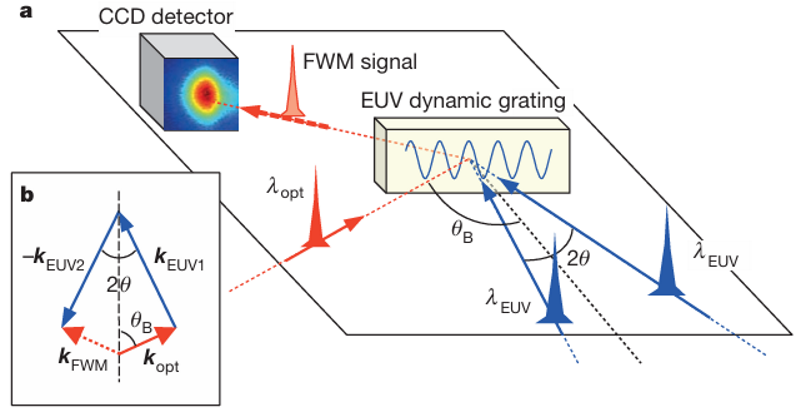 圖1 使用FEL EUV產生TG進行四波混頻(FWM)實驗[Nature, 2015, 520: 205]。a、基于 FEL 的 FWM 實驗示意圖,兩束λEUV產生EUV TG,CCD 傳感器放置在 FWM 信號光束 (kFWM) 的預期傳播方向上,該方向由“相位匹配”決定(如圖 b 所示;其中 kopt、kEUV1 和 kEUV2 分別為光脈沖和兩束 FEL 脈沖的波矢)。