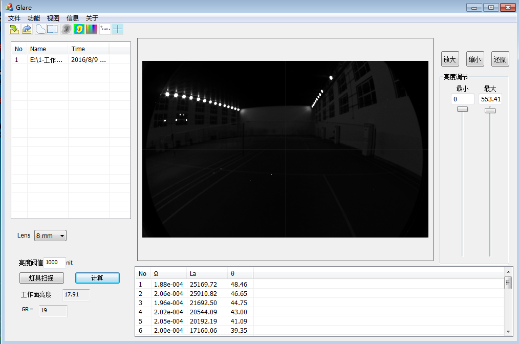 Glare眩光測量軟件解決了不同的環境光源和觀察者視角的空間位置對應關系,合理準確地描述了光在人眼的散射效應。對不同的照明條件和環境,做了相應的測試方案,解決了室內、室外等不同場景的眩光測試。