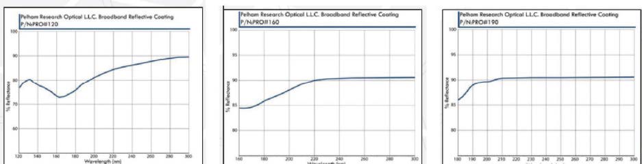 Pelham Research Optical(PRO)VUV / UV 寬帶鏡面涂層設計用于在真空臨界波長下提供良好的反射率。 為了確保質量的一致性,每個涂層批次在12 度入射角下測量反射率。可以根據(jù)客