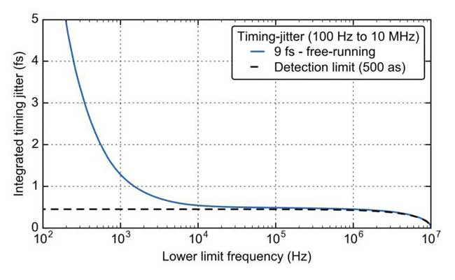 Menhir Photonics 為這種應用提供極低位相噪聲、高可靠度的鎖模激光器。圖1展示了250MHz重復頻率的MenHIR-1550 的典型位相噪聲。相位噪聲在10GHz載波(40階諧波)上測量。噪聲本底給出的累積時間抖動上限越為500as(阿秒)。