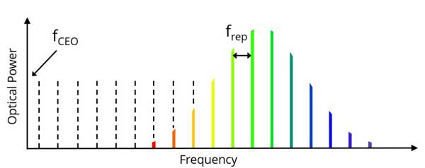 一臺(tái)光頻梳可以認(rèn)為是一把頻率測(cè)量的標(biāo)尺。如果“梳齒”(每個(gè)分立譜線的頻率)的頻率已知,就可以用拍頻的方法來測(cè)量其他的頻率。拍頻信號(hào)的頻率是梳齒頻率與未知頻率之間的差。當(dāng)需要測(cè)量很寬范圍內(nèi)的未知頻率時(shí),光頻梳需要較大的帶寬,也即“較長(zhǎng)的尺”。