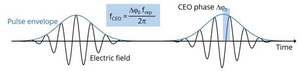 如果激光脈沖 — 不僅僅是脈沖包絡(luò),也包括電場(chǎng)— 序列是嚴(yán)格周期性的,所有的梳齒頻率就會(huì)簡(jiǎn)單的等于激光器重頻的整數(shù)倍。在實(shí)際的振蕩器中,電場(chǎng)相對(duì)于包絡(luò)通常有一個(gè)漂移。相鄰脈沖之間,載波包絡(luò)的峰值與電場(chǎng)峰值之間的相移的差被稱為載波包絡(luò)漂移 (CEO). 在頻域,表現(xiàn)為梳齒頻率與“零位”,即重復(fù)頻率整數(shù)倍之間的差值,稱為載波包絡(luò)漂移頻率 (fCEO) . 如果“重復(fù)頻率” frep 及“載波包絡(luò)漂移頻率” fCEO 已知,則所有梳齒頻率都可確定知道。