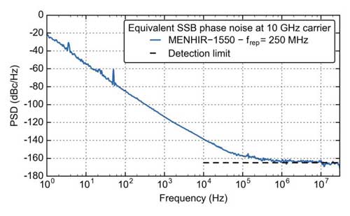 Fig 1.: (上) 在10GHz諧波上測(cè)量250MHz重頻的MENHIR-1550激光器的位相噪聲功率譜;(下)同一臺(tái)激光器的10MHz起累積時(shí)間抖動(dòng).