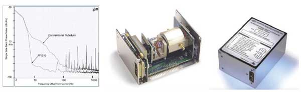 美國SRS公司銣鐘PRS10的10MHz輸出來自第三倍頻,應力補償(SC-cut)晶體振蕩器工作在一個恒溫室中,雙回路RF合成器(晶體頻率22.482MHz)產生359.72MHz,并讓6.834 GHz頻率通過階躍恢復二極管。這樣的設計可以使相位噪聲非常低(< −130 dBc/Hz at 10 Hz),即便在沒有鎖定銣原子的情況下,其輸出表現(xiàn)也很良好(老化率:<5 × 1E−10 /day),與傳統(tǒng)銣鐘相比相位噪聲降低42dB(如下圖),并使用側臂裝有1毫克銣的燈。消除了銣耗盡作為一種失效機制,并提供了更好的溫度控制,而沒有多余的閃爍噪聲。