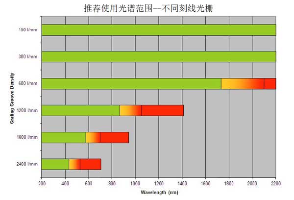 在相同測試條件下(狹縫不變),提升光譜分辨率的方法通常有兩個:一是延長光譜儀的焦距,同等情況下,光譜儀的焦距越長,分辨率越高! 但這樣就意味著光譜儀的尺寸變得越來越大,光路調校變得越來越困難! 另一個有效途徑是利用高刻畫線的衍射光柵,,比如同等情況下,2400g/mm 的光柵分辨率相比1200g/mm 的光柵可以提升大約1倍; 但同樣由于刻畫光柵衍射角度的關系,高刻線光柵的波長使用范圍也同樣會急劇縮小,比如,1200g/mm 的光柵最大波長使用范圍到1200nm, 而2400g/mm 的光柵最大波長使用范圍則只能到600nm, 也就是說通常高刻線光柵都只適用于紫外波長范圍的高分辨率光譜測試, 對于可見光(VIS)以及延伸的紅外 NIR 波段,要想獲得高分辨率的光譜,提高光譜儀的焦距幾乎變成了可行的一種方案!