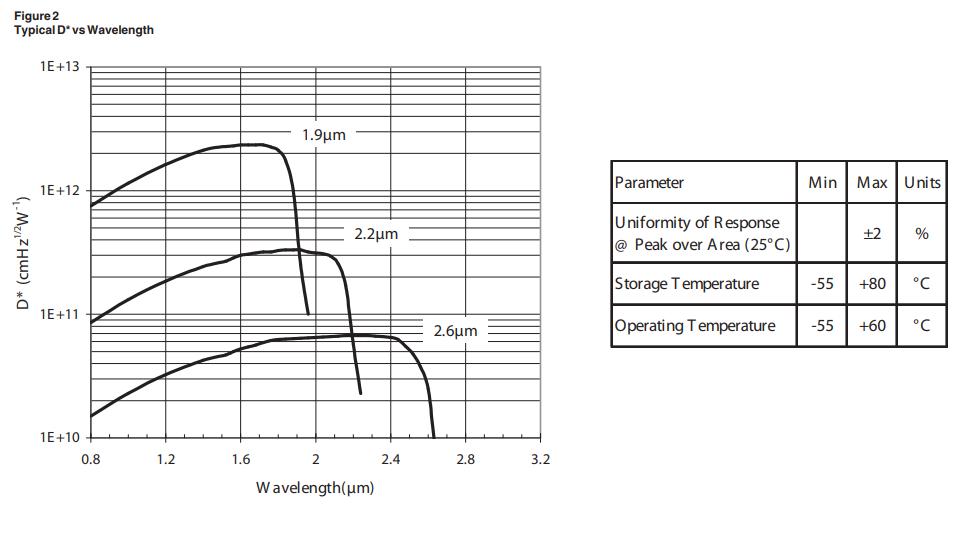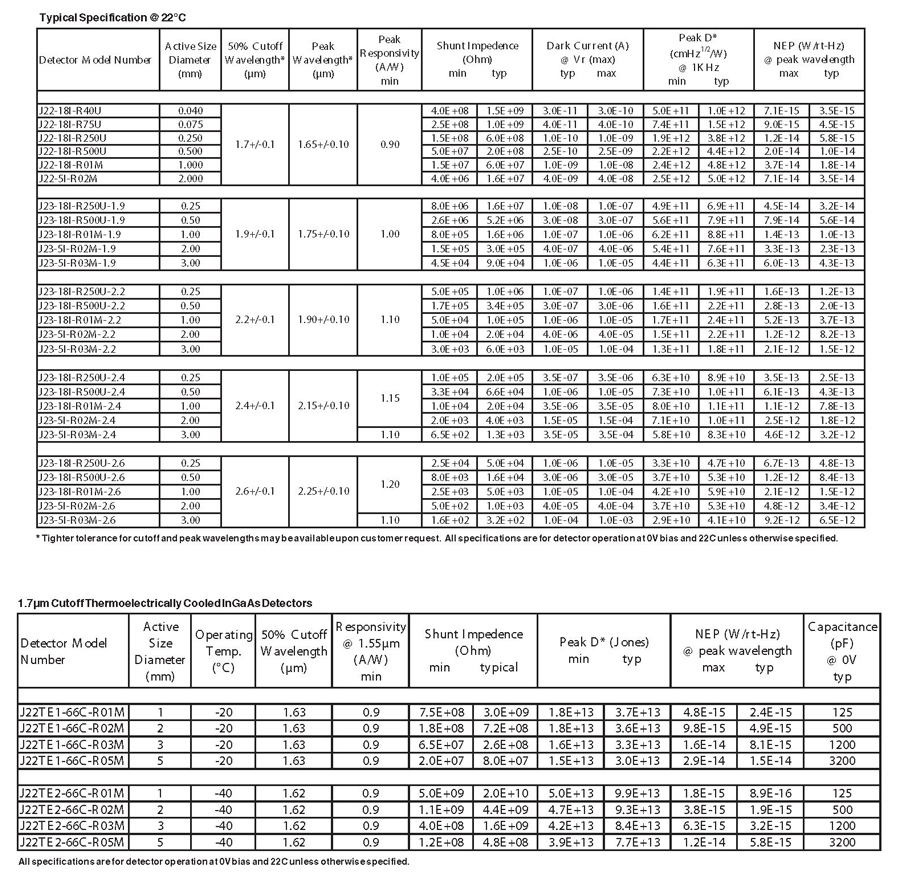 高性能InGaAs紅外探測器具有快速的響應時間、出色的靈敏度和長期的可靠性。根據In、Ga、As三種元素的比例不同,探測器有四種截止選擇,分別為1.9µm, 2.2µm,2.4µm和2.6µm,為客戶的不同應用提供合適的產品。