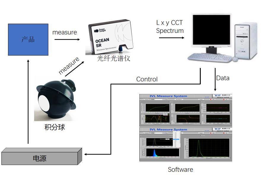 該系統是集成積分球、暗箱、光纖光譜儀、系統檢測軟件、電腦為一體的自動化檢測系統,主要應用于實驗室、產線PCBA模組光色參數的測量與校準。