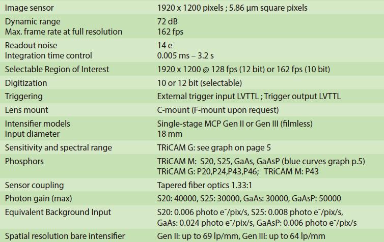 TRiCAM內部有一片快速CMOS傳感器,通過光纖與像增強器耦合,從而達到最佳的傳輸效率。TRiCAM有著很高的靈敏度,在最快幀率可達162fps的情況下,可探測低至單光子的信號。
