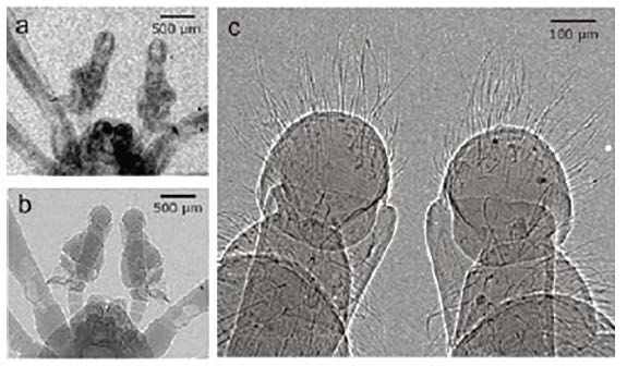 蜘蛛腿, 5μm 脈沖液體射流源, 50 kv, 0.8 mA, 放大倍數:左x1,右x4, 4K*4K 分辨率,9um 像素;