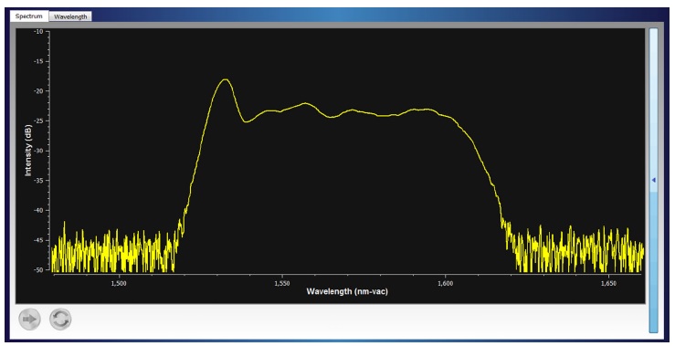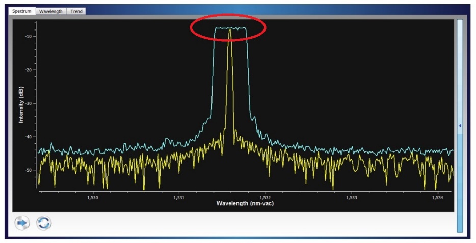 如圖五所示,黃色譜線是最近一次采樣的激光頻譜,藍(lán)色譜線為伴隨著波長(zhǎng)調(diào)諧做多次激光頻譜測(cè)試的包絡(luò)線,所以藍(lán)色譜線的上沿平頂部分是分布反饋激光器在調(diào)變激光波長(zhǎng)后掃描下的激光主模波長(zhǎng)調(diào)諧的軌跡。無論對(duì)于科研用戶還是系統(tǒng)整機(jī)制造廠家,都是一個(gè)直觀評(píng)價(jià)可調(diào)諧激光調(diào)諧頻段的操作界面。