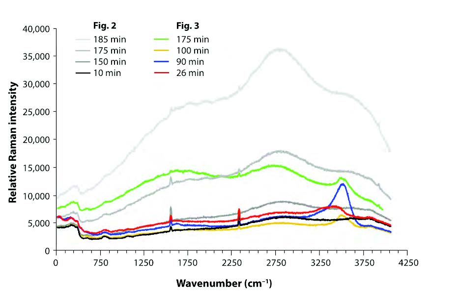 圖 反應氣體的拉曼光譜強度- 時間關系圖和熱刨面圖