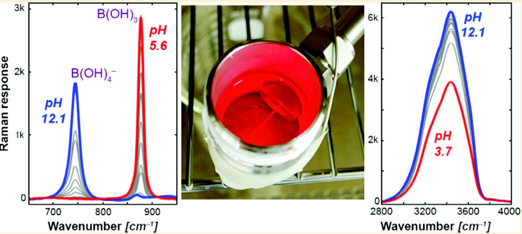 圖 實驗裝置(中)和溶液pH 值、硼酸濃度的拉曼光譜圖(左、右)