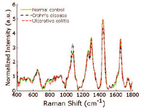 正常腸道組織,階段性腸炎,潰瘍性腸炎拉曼信號(hào)比對(duì)