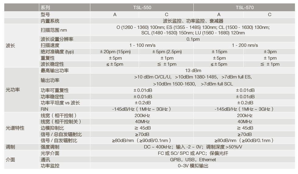 連續掃頻窄線寬激光器是Santec 公司的拳頭產品。采用Littrow 架構的ECDL,可 實現通訊波段單縱模<100kHz 線寬的輸出,13dBm 功率,無跳模掃頻范圍達到100nm,每秒可掃描200nm。Santec TSL 分為5 系列和7 系列。其中5 系列分為A、C 兩個級別,又按照波段范圍分為O(1260~1350nm)、ES(1355~1485nm)、CL(1500~1630nm)、SCL(1480~1630nm)、LU(1560~1680nm)多個型號;7 系列性能更高,主要針對CL、SCL 波段。