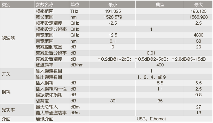 WSS-1000 可實現濾波曲線的多方面編程,包括濾波線形、衰減、多通道濾波、端口(1×1,1×2,1×4,1×9)選擇等。