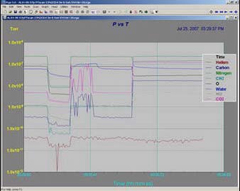 UGA系統(tǒng)自帶windows 軟件,實時采集數(shù)據(jù)和圖形化顯示,操作方便快捷。軟件功能中包含模擬的柱狀掃描模式、壓力和時間關系圖、檢漏測試、氣體分析和在線分析。標準的GPIB 和RS232 接口方便與計算機連接控制。