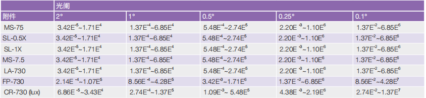 備注:亮度值均是在 2°光闌,PR-730/740:8nm 光譜寬度 , PR-735/745: 14nm 光譜寬度條件下計算得出。