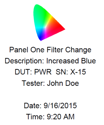 測試完成后,VideoWin可以創建定制報告記錄測試結果,保存為PDF格式。根據屏幕上顯示的內容,記錄包括所拍攝的圖像,數據表格,Pass/Fail的信息和1931 CIE圖顯示的測量點的色度數據。