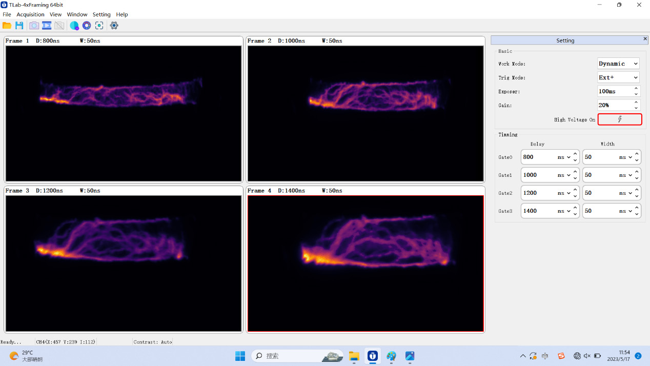 延遲800ns-1.4us放電,間隔200ns, 門寬50ns, 清晰可見放電區域逐步膨脹過程。